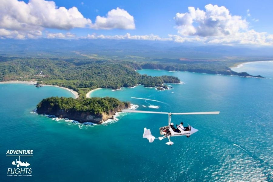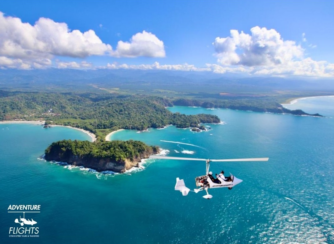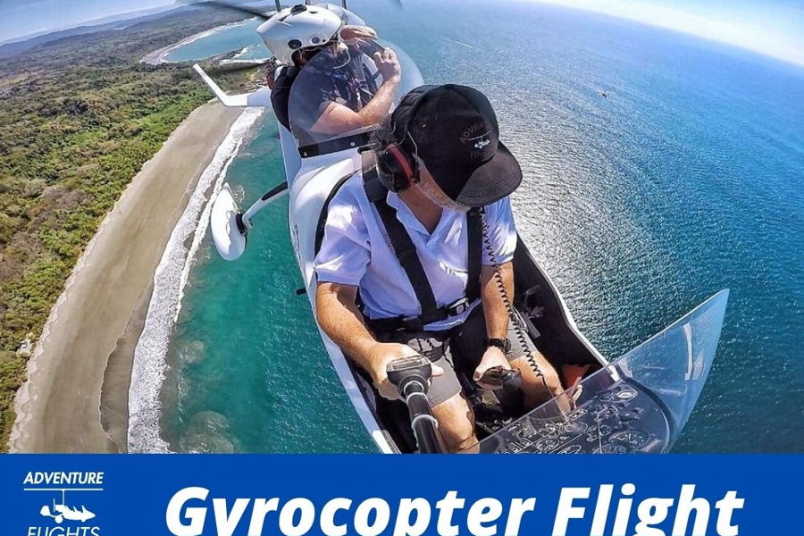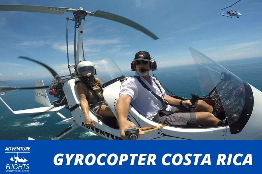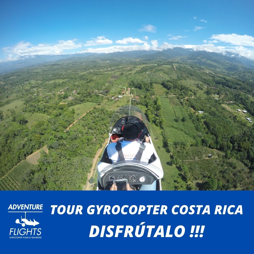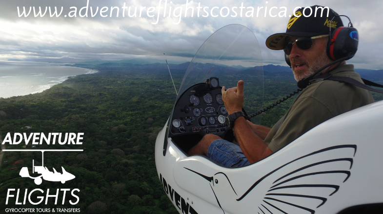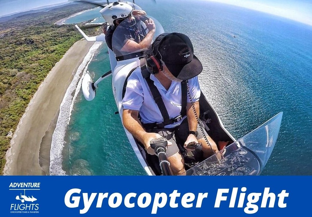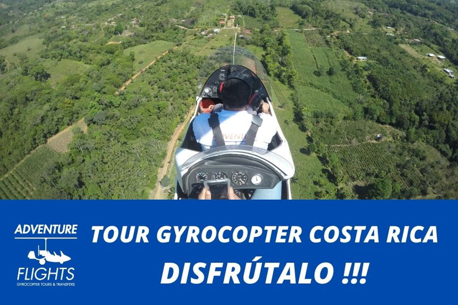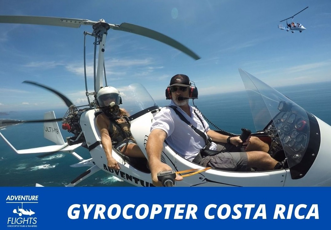 Tours de vuelo en Gyrocopter o Autogiro, recorrer desde el cielo entre 150 y 300 metros de altura, zonas de Costa Rica imposibles de visualizar si no es desde el aire. Se trata de un Tour escénico inigualable, posibilidad de ver ballenas, tortugas, mantas rayas..