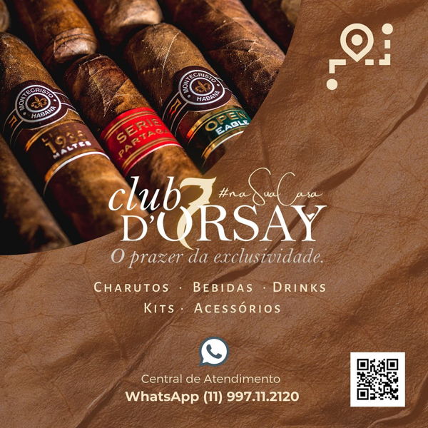 7 anos transformando charutos em experiências exclusivas. São 3 ambientes exclusivos para degustação de charutos: área externa, Cigar Bar 1. Andar (aberto ao publico) e Cigar Lounge com Lareira - 2. Andar, exclusivo para membros do Club D'Orsay.